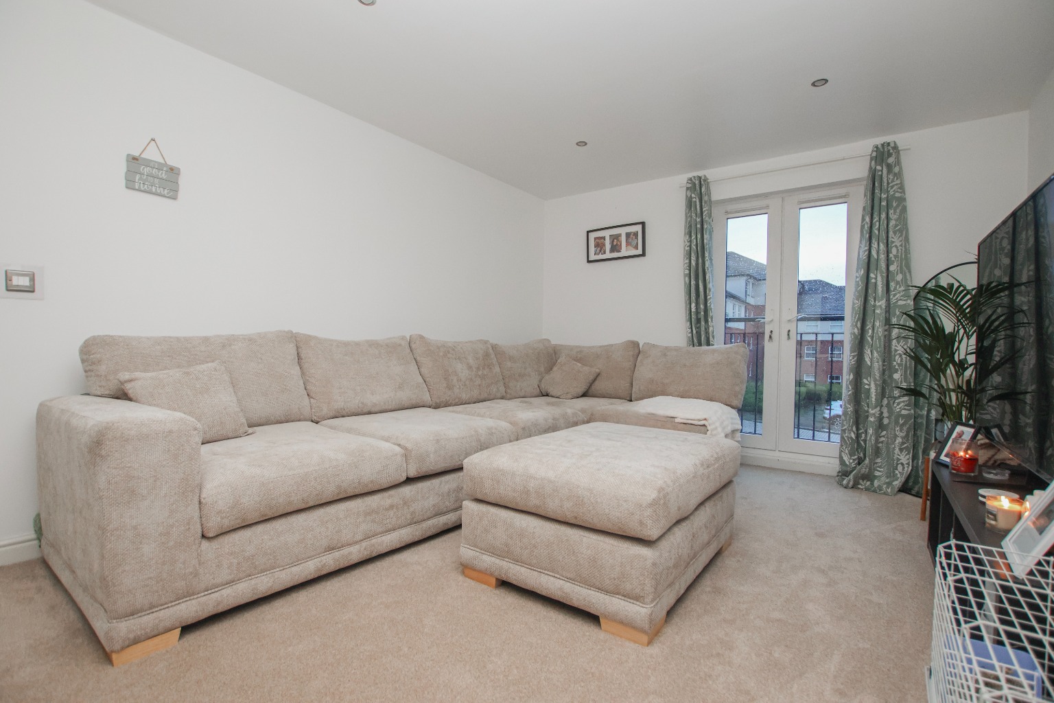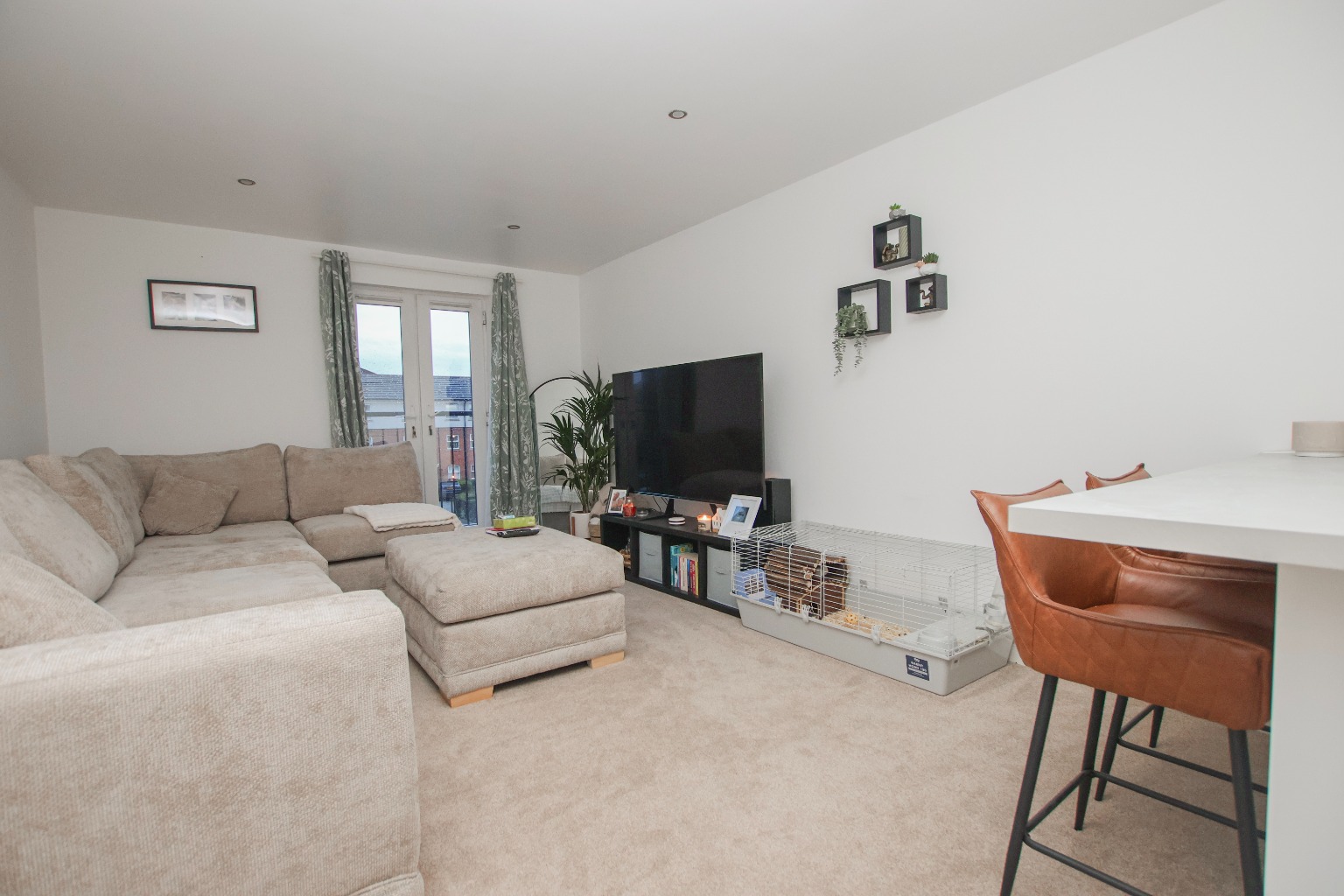 The heart of the home is the impressive open-plan kitchen, dining and living space, measuring approximately 6.8m x 3.4m. This is a bright and sociable area, enhanced by a Juliet balcony allowing natural light to flood in. The kitchen itself is fitted with a range of modern wall and base units with work surfaces over, incorporating an induction hob with extractor, electric oven, sink with drainer and splashbacks. There is space and plumbing for a washing machine and dishwasher, as well as space for a fridge freezer, making this a practical and well-equipped space for everyday living.