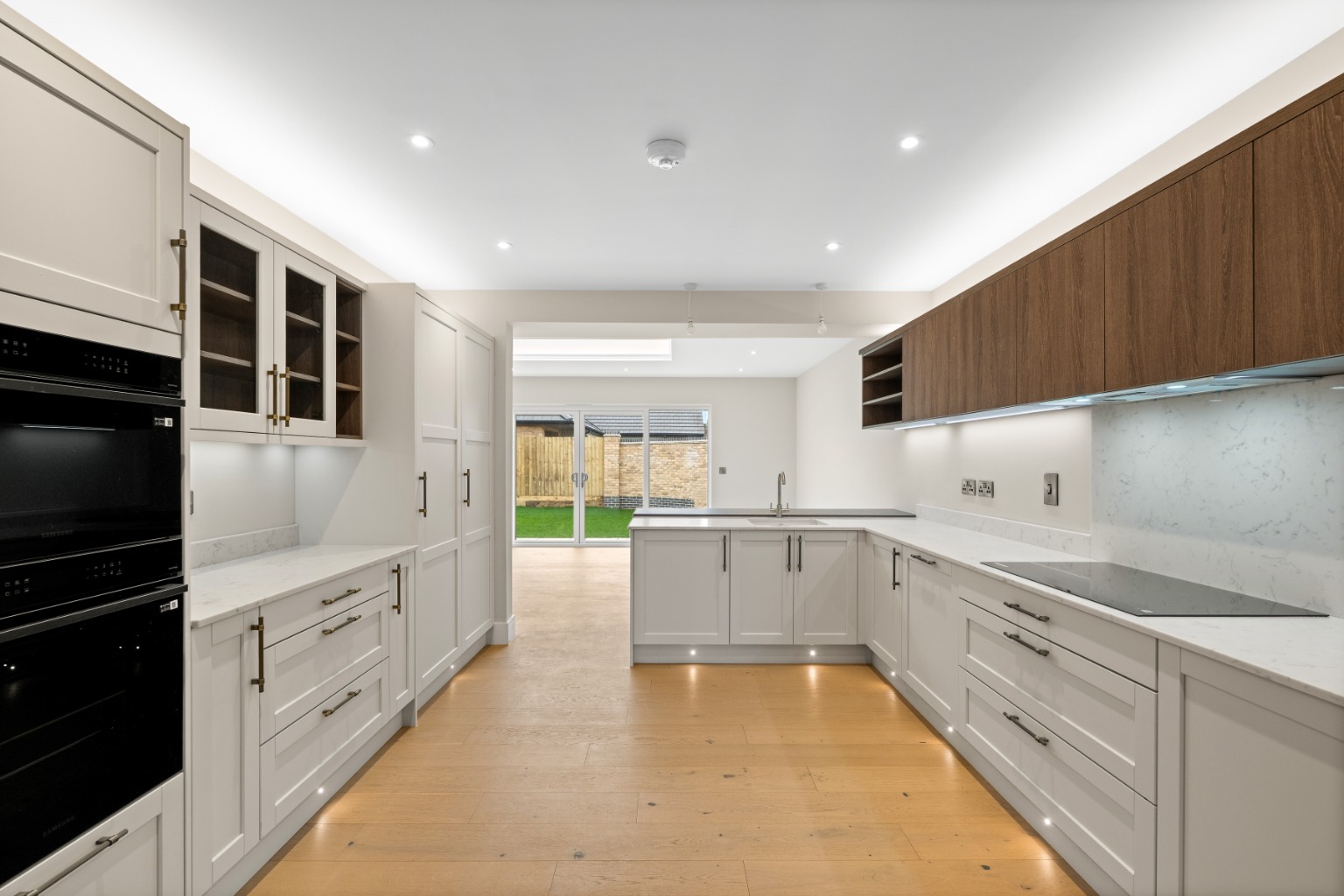 Integrated Samsung appliances include a double oven, induction hob with extractor, dishwasher, and full-height fridge and freezer, alongside a dedicated dresser area. Feature lighting enhances both the form and function of the space, making it equally suited to everyday living or entertaining on a larger scale.