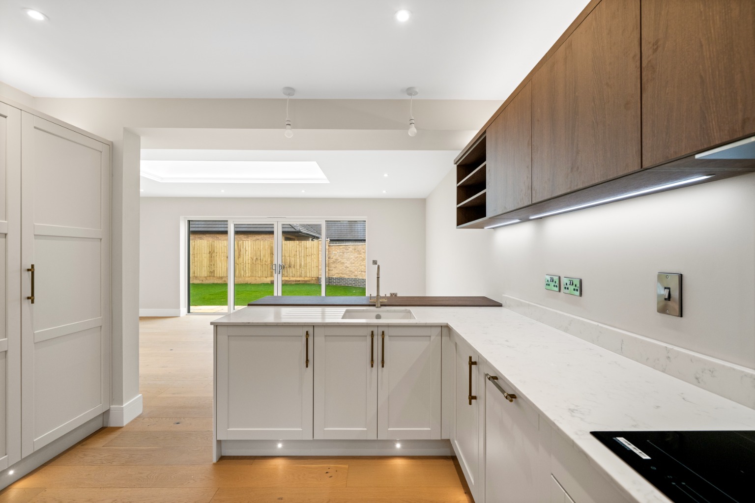 The kitchen sits confidently at the heart of the home, balancing timeless design with modern functionality. Shaker-style cabinetry with dark wood interiors is paired with elegant quartz work surfaces, including matching upstands and a refined hob splashback, all extending into the utility room for a seamless finish.