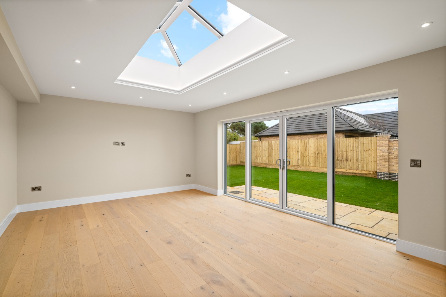 A block-paved driveway provides off-road parking, while the rear garden has been landscaped with turf, structured planting, and an Indian sandstone patio — ideal for outdoor dining and relaxed summer evenings. External lighting, an outside tap, and an external socket have all been incorporated to ensure the garden is as practical as it is attractive, with boundary walling offering a defined and private setting.