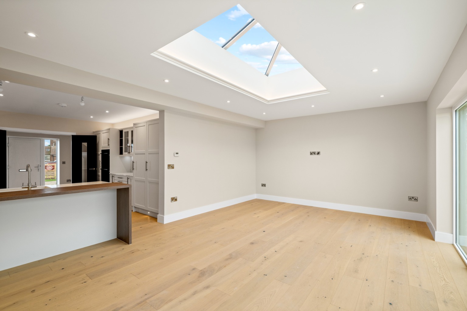 The internal finish is quietly confident. Engineered wood flooring flows seamlessly through the principal living spaces, kitchen, utility, hallway, and walk-in wardrobe, creating cohesion and a sense of space, while plush carpeting to the bedrooms adds softness and comfort. Contemporary black internal doors provide a striking contrast, elevating the interiors with architectural definition, while double-glazed internal doors open into the kitchen, allowing light to travel freely throughout the home.