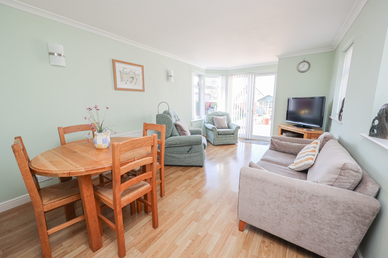 The property sits on a well-maintained plot with a driveway providing parking for multiple vehicles (approx. 2 cars), along with a detached brick-built garage positioned adjacent to the home. The rear garden is fully enclosed and primarily laid to lawn, complemented by patio seating areas and planted borders, creating a private and manageable outdoor space perfect for relaxing or entertaining. To the front, the property benefits from a feature tree and a welcoming frontage.
