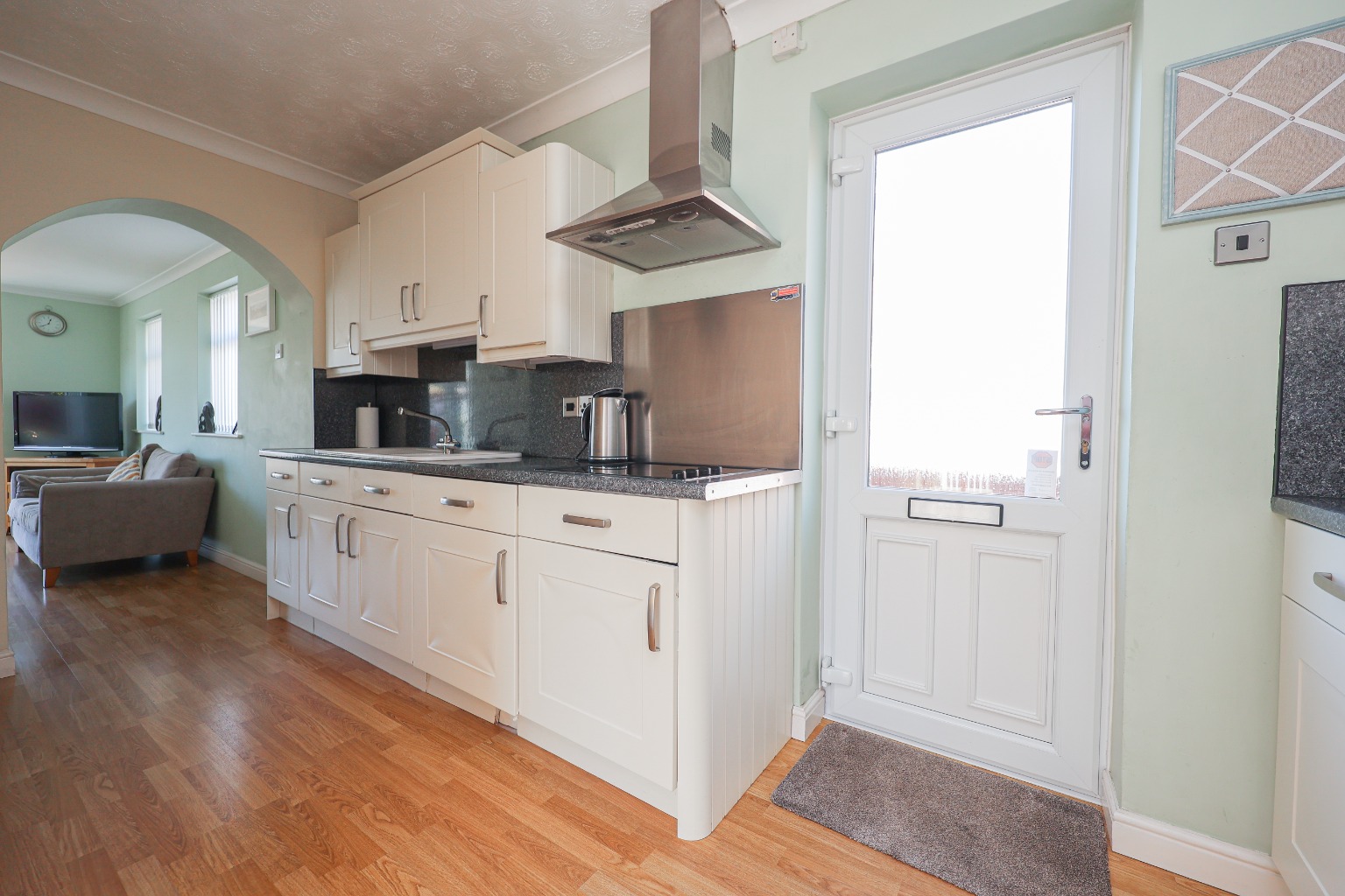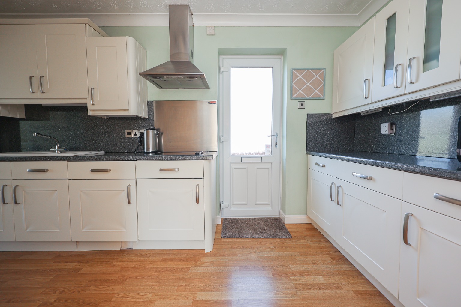 There is a spacious internal hallway, offering laminate flooring, a large side-facing window allowing natural light to flood the space, and access to a useful understairs storage cupboard. The kitchen (3.40m x 2.60m) is fitted with a range of wall and base units with worktops over, complemented by wooden flooring. There is an electric oven and grill, four-ring hob with extractor over, integrated washing machine, stainless steel sink and ample socket points, making it a practical and functional space. Flowing through, the lounge/dining room (4.80m x 3.00m) offers a bright and sociable living environment, benefitting from windows to multiple aspects and French doors opening directly onto the rear garden, ideal for indoor-outdoor living. Additionally, there is a separate front lounge (6.10m x 3.00m), featuring a fireplace, fitted carpet, radiator and large windows to the front aspect, creating a cosy yet spacious second reception area. The ground floor also benefits from a modern shower room (approx. 1.80m x 1.60m), fitted with a shower, WC, wash basin and radiator. A further versatile space is provided via a dressing room (2.30m x 1.90m), leading into bedroom three (3.20m x 2.30m), which includes built-in storage, wood flooring and a window to the side.