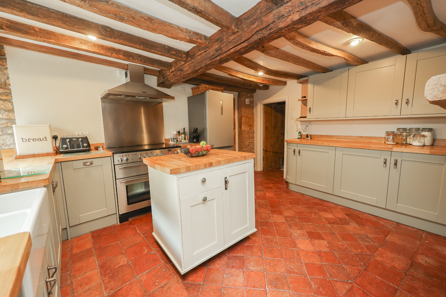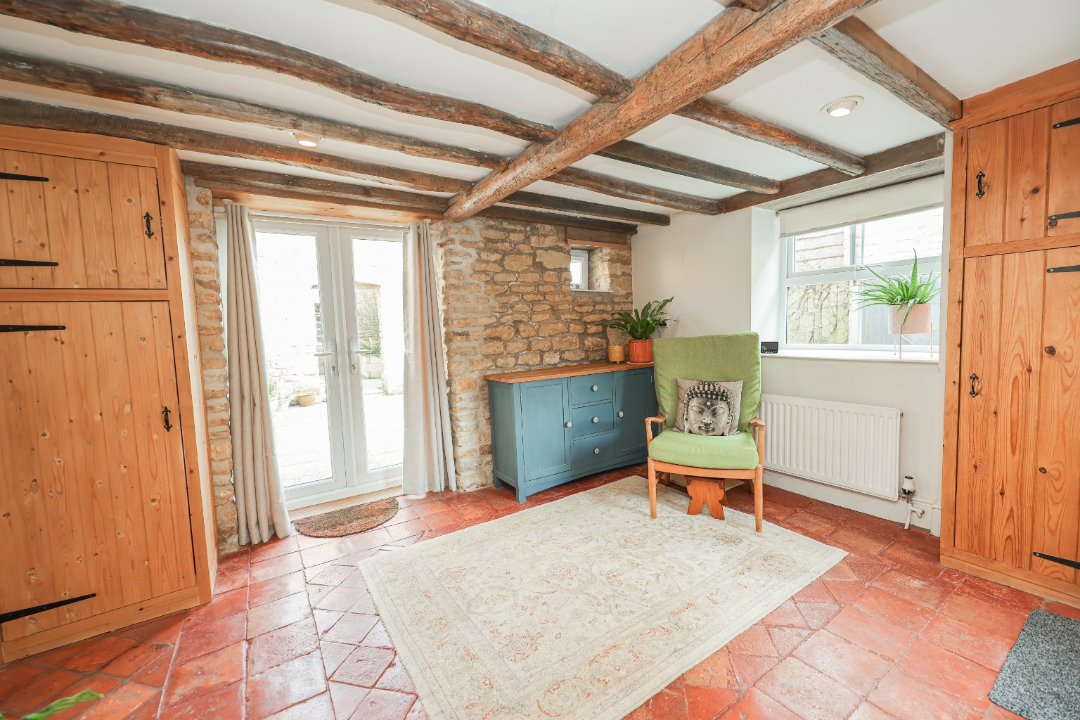 From the moment you enter, the home’s character and warmth are immediately apparent. The entrance hall leads through to a cosy sitting room (3.43m x 3.86m), centred around a traditional open fireplace, creating the perfect space to unwind. To the front of the property, a versatile additional reception room (3.40m x 3.81m) offers flexibility as a fourth bedroom, home office or snug, depending on your needs. The heart of the home is the kitchen (3.83m x 4.11m), installed approximately 2/3 years ago, which combines traditional styling with modern convenience. Featuring a Belfast sink, a range of quality units, original quarry tiled flooring and a wood-burning stove, this space perfectly reflects the cottage’s heritage. Leading on, the breakfast room (3.78m x 2.94m) provides a wonderful transitional space, with French doors opening onto the garden and access down to a useful cellar. The property then opens into the truly spectacular barn conversion (8.15m x 3.22m) – a stunning reception area with vaulted ceilings, exposed beams, skylights and a feature apex window. With underfloor heating and bifold doors connecting seamlessly to the garden, this space is ideal for entertaining or modern open-plan living. The ground floor is further complemented by a utility area suitable for washing machine and tumble dryer, and a convenient WC.