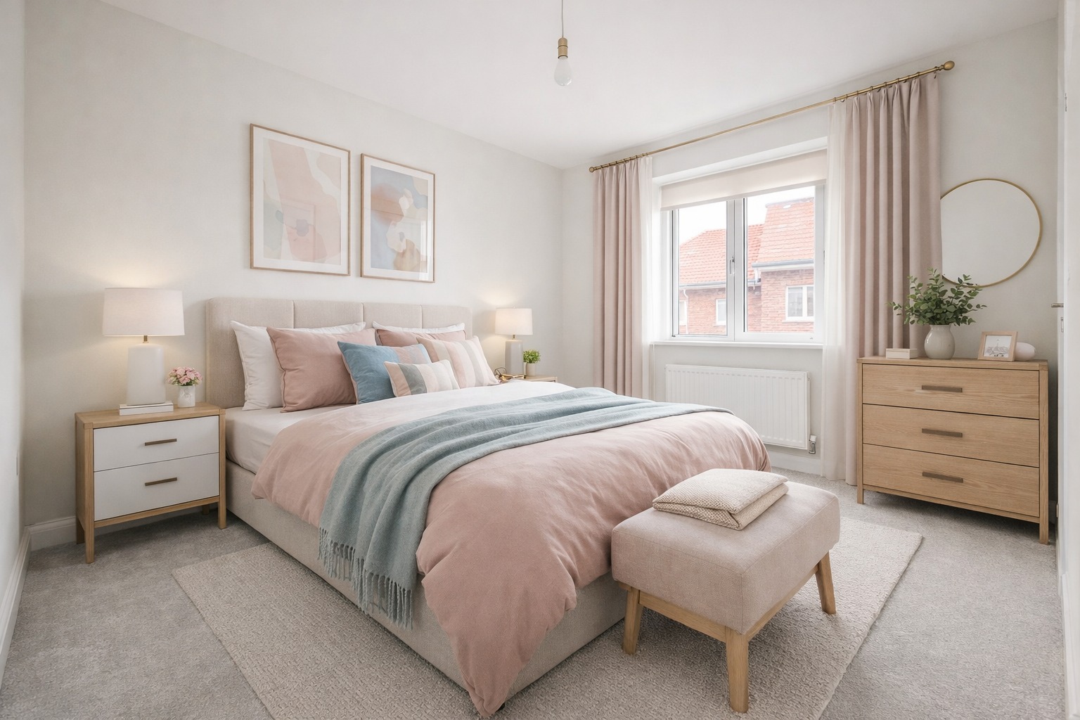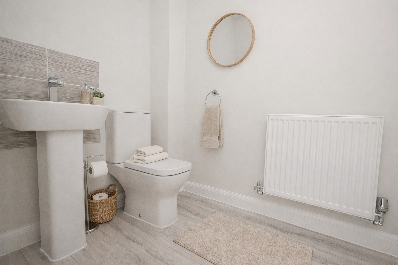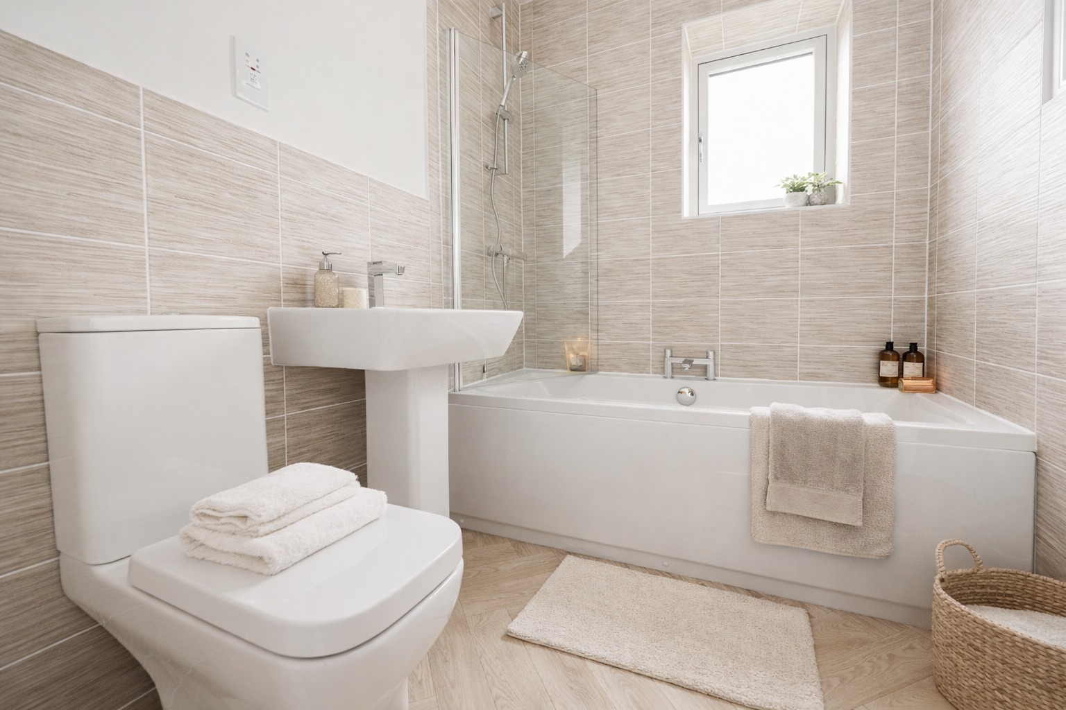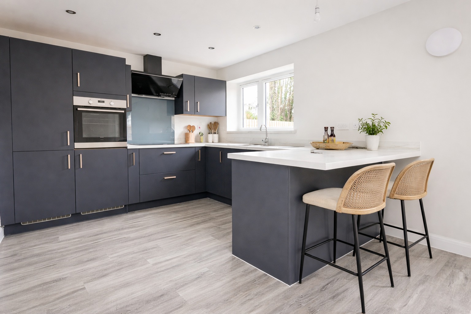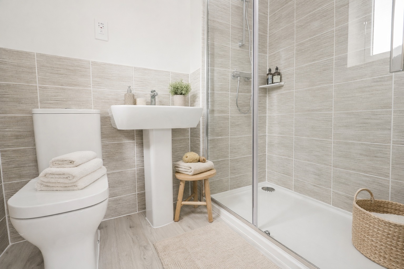 Homes at Kings Meadow have been finished with a carefully considered specification that prioritises quality, efficiency and comfort. The kitchen is supplied by Symphony and includes integrated appliances as standard, complemented by contemporary work surfaces and modern cabinetry. Bathrooms feature Porcelanosa sanitaryware, thermostatic showers and tasteful wall tiling, creating clean and timeless spaces. Heating is provided via an air source heat pump, offering an energy-efficient and future-focused solution. Double glazed coloured windows, block paved driveways, turfed gardens and broadband connectivity all come as standard, while selected homes also include flooring throughout. External finishes are plot-specific, giving each home a degree of individuality while maintaining a cohesive and attractive street scene.
